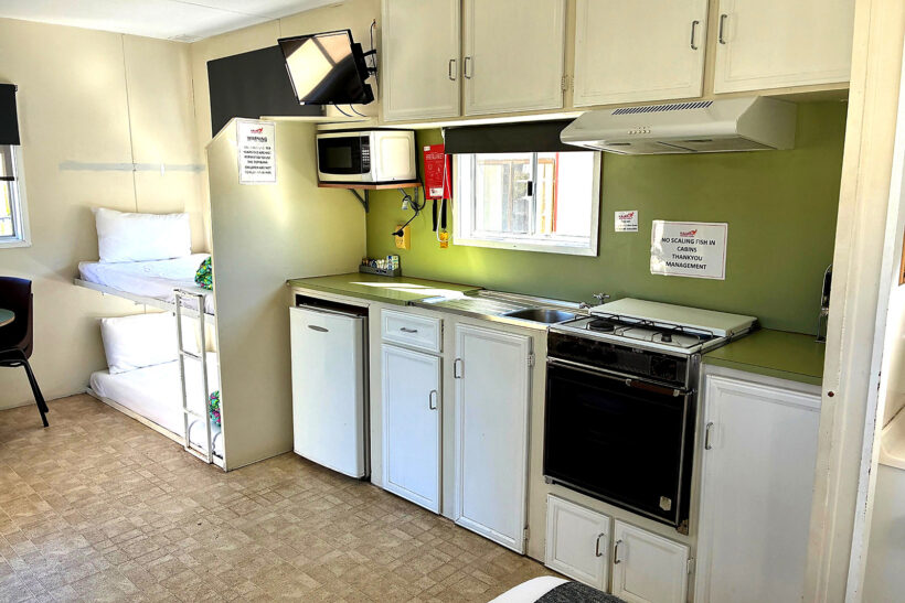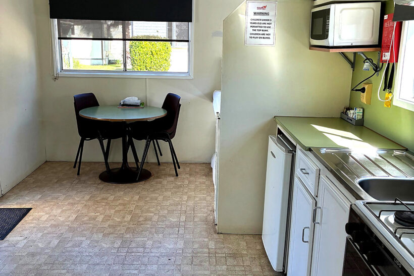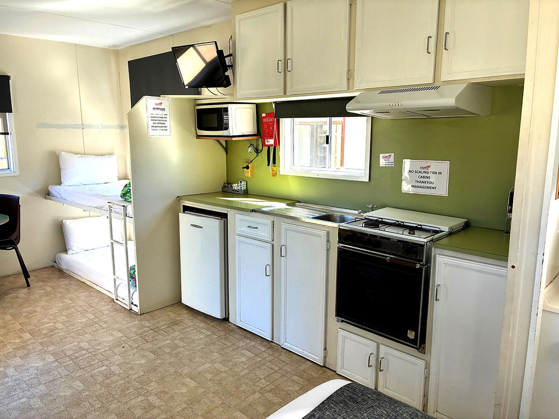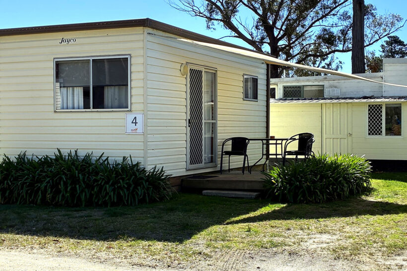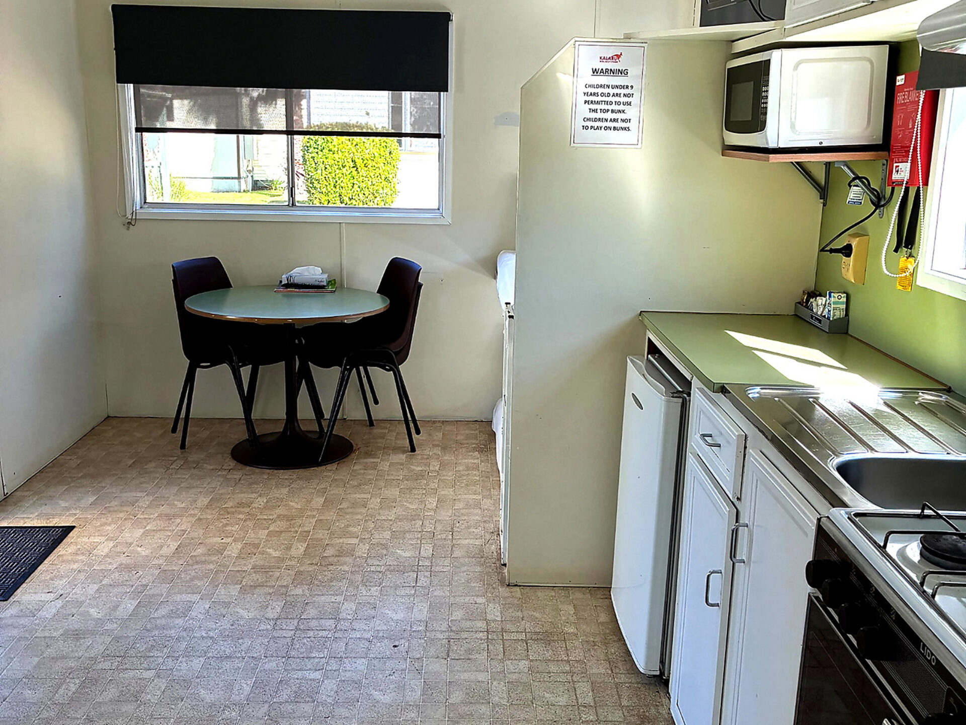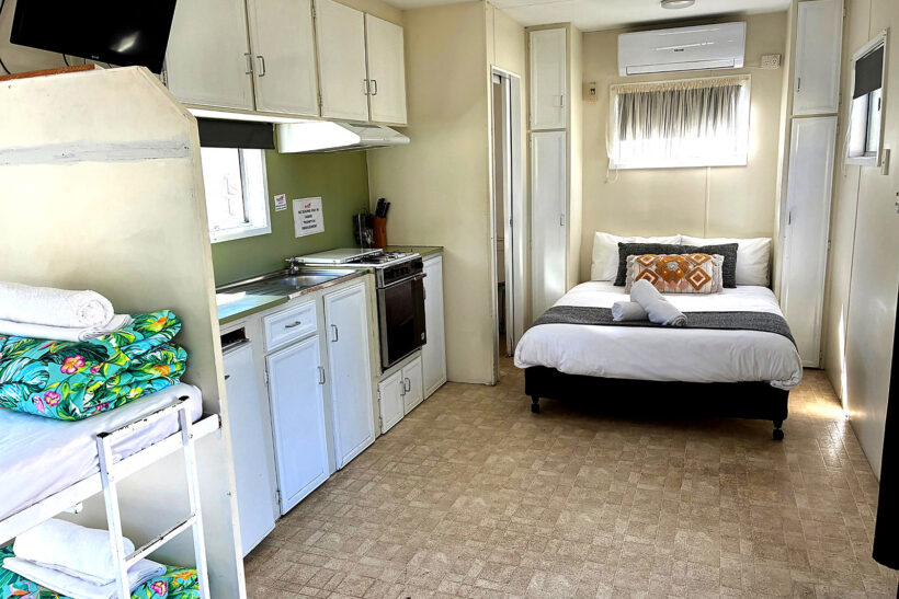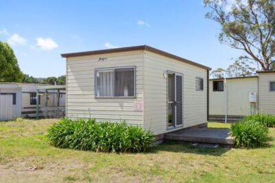This pet-friendly studio sleeps up to 4 guests with a double bed and a set of single bunks. It includes an ensuite toilet, with showers located nearby at the amenities block. Linen is supplied for all beds. Along with a small kitchenette and reverse cycle air conditioning, this simple cabin offers a convenient base to enjoy the park surroundings.